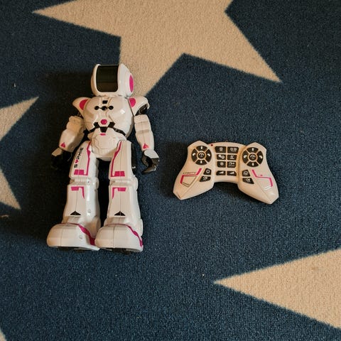 Kaksi samanlaista robottia jotka toimivat pattereilla ja kauko-ohjaimilla.