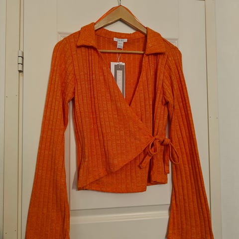Pitkähihainen persikka oranssi paita. Hengittävää puuvillaa. L koko ja venyy. Persikan oranssi pitlähihainen paita, o-muotoinen kaula-aukko, venyvä, rento
