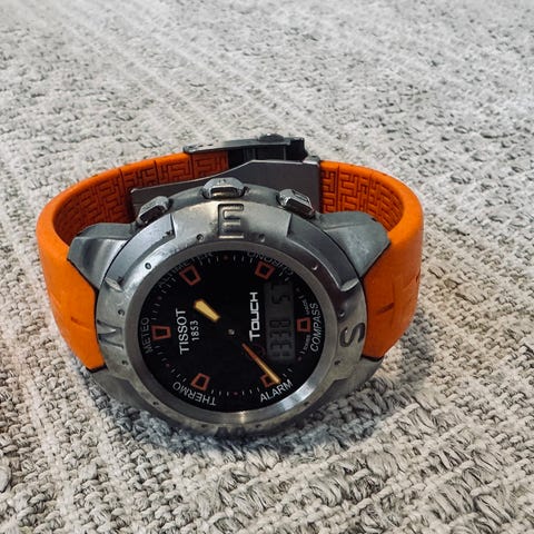 Kuvan kello on ruotsalaisen Åkerfalk-merkin First Season -malli. Se on erottuva 24 tunnin kello, jonka tuntiviisari tekee vain yhden kierroksen vuorokauden aikana. Käytetty kerran. Kellon pahvilaatikkoa ei löytynyt. Musta NATO-ranneke. Nouto Kauklahdesta.