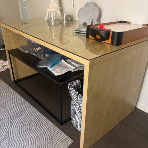 Espoo Perusmäki ikean pöytälevy lasilevyllä 140x75 cm, sivulevyt (sivujalkojen ja pöytälevyn kiinnitykset hukassa), pieniä käytönjälkiä on. Muuten lähtee kierrätyskeskukseen. Pohjalevyssä ollut kiinni jalat kiinni ruuveilla, näistä jäljet. Säilytetty lämpöisessä varastossa. Nyt kuvaus osittain ulkona.