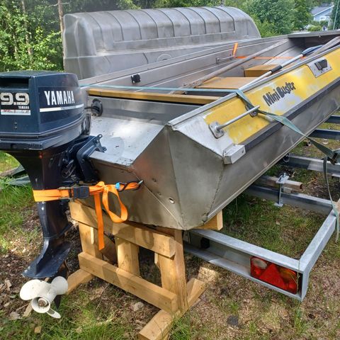 Minibuster joka häikäisee muut kimalluksellaan. Kuten kuvasta näkyy niin pitää vettä, moottori on 9,9hp mercury. Ohjauslaitteet, moottori, moottoripukki sekä tietysti vene koko pakettina.