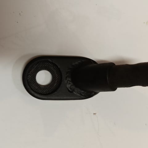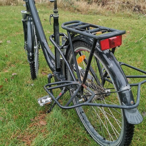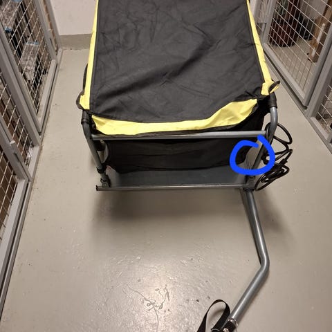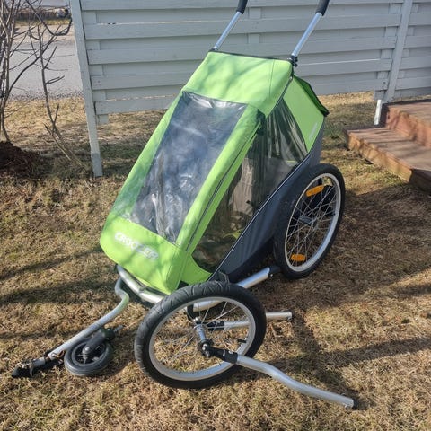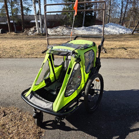 Yhden lapsen istuttava peräkärry. Turvavyö ja kiinnitysosat hyvässä kunnossa, etuosan vesikalvossa halkeama.