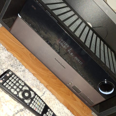 Ostetaan kuvan liittimille sopiva vahvistin. Yhteensä liittimiä on kuusi (subwoofer, kaksi pystykaiutinta ja kolme pienempää). Tässä merkkinä Panasonic, mutta mikä tahansa näihin sopiva käy, jos löytyy edullinen toimiva laite. Paikkakunta ensisijaisesti Joensuu.