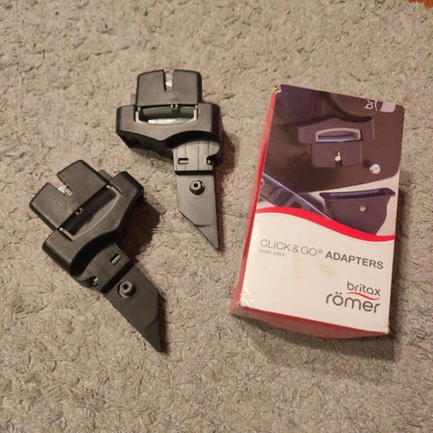 Britax Römer Click & Go receivers -adapterit lastenvaunuihin. Adapterit mahdollistavat Britax Römer -turvakaukalon kiinnittämisen yhteensopiviin vaunurunkoihin Click & Go -kiinnitysjärjestelmällä. Pakkauksessa on kaksi adapteriosaa sekä käyttöohjeet.