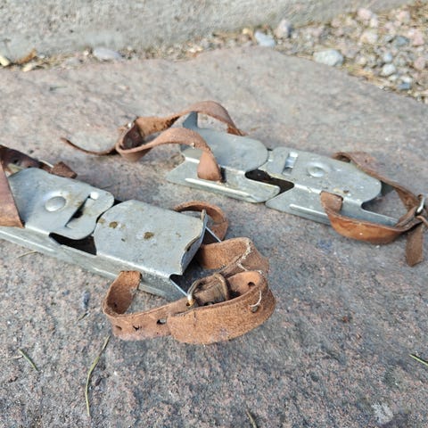 Kenkiin kiinnitettävät luistinterät, merkki Sport, 1950-luvulta. Metallia. Luistimissa (koko?)merkintä 24 eli sopinevat koon 36-37 kenkiin.