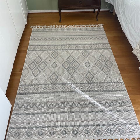 Veke matto, vaalea/valkoinen. Pinta on kudottua materiaalia, jossa on kohokuvioitu, pörröinen kuviointi. Päissä on suuret koristeelliset tupsut. Matto soveltuu esimerkiksi olohuoneeseen, makuuhuoneeseen tai käytävälle. Yhdessä kohdassa näkyy tummentumia tai tahroja, mutta uskosin että lähtee pesussa.