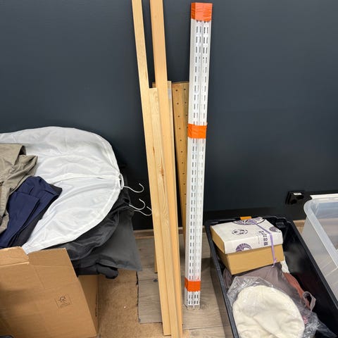 Kolme hyllyä, kiskot, kannattimet ja vaatetanko.