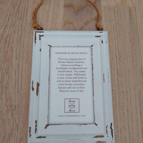 Riviera Maison Happy Memories -taulu. Valkoinen kehys. Takana on tukijalka pöydälle asettamista varten sekä ripustusmahdollisuus seinälle. Tukijalan kiinnitys on hieman irti, näkyy kuvissa. Pysyy kuitenkin edelleen pystyssä jalan kanssa.
