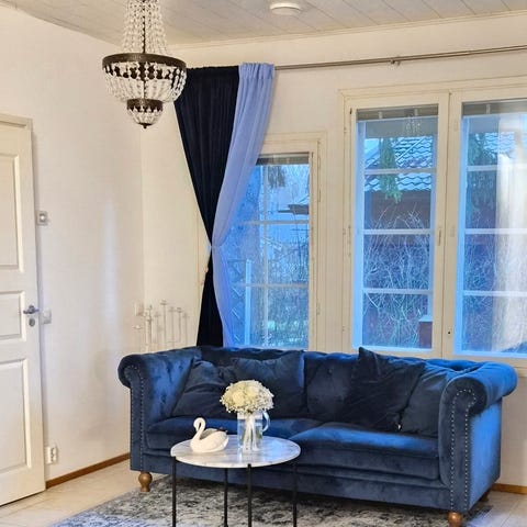 Kiinteät tyynyt, samettia, ei tahroja, Maskusta ostettu. Pituus kulmasta käsinojalle on 220 cm molemmin puolin eli yhteensä 440 cm, kokonaiskorkeus 80 cm, istuinsyvyys 55 cm, istuin korkeus 42 cm, syvyys 90 cm.