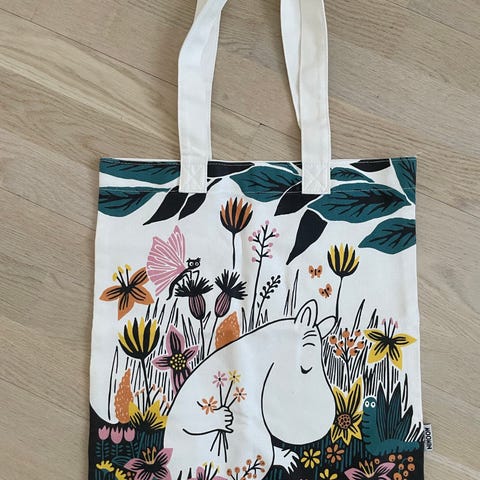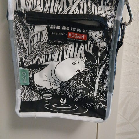 Finlayson Moomin pöytäliinasta tehty Chrisubag handmade in Pori kangaskassi naisille. Kassissa on siniharmaa muumikuvioitu päällikangas ja kukkakuvioita. Sisäpuoli on pellavakangas, pinkkivärinen , jossa on sisätasku pienille tavaroille. Kassissa on vetoketju , postitus onnistuu, hinta 20€