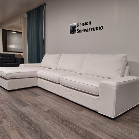Myynnissä Ikean Kivik sarjan kulmasohva. Kivik sarja tunnetaan erittäin vahvasta rungostaan. Sohvan runko ja jouset ovat ehjät. Sohvan kaikki päälliset ovat irrotettavissa pesuun. rungon päällinen mukaan lukien. Lisäksi päälliset ovat halutessaan vaihdettavissa. Päällisten väri: Tallmyra beige. PÄÄLLISET OVAT KÄYTTÄMÄTTÖMÄT JUURI IKEASTA HAETUT. Pelkkien päällisten normihinta: 489€. Tällä hetkellä Kivik sarjan päälliset ovat alennuksessa. Alennettu hinta: 391,20€, joten itse sohvalle ja tyynyille ei juurikaan hintaa enään jää. Huomioitavaa sohvien kunnossa: Sohvan runko ja tyynyt ovat olleet koirataloudessa. Tästä johtuen päällisten alle jäävään rungon kankaaseen jäi puhdistuksesta huolimatta hieman lemmikinkarvoja. Karvat eivät näy päivittäisessä käytössä mihinkään, mutta sohva ei sovellu allergia talouteen. Ikeassa uuden sohvan hinta: 1439e. Sohvan alennettu hinta: 1151,20€. Meiltä sohvan saisi: 679€. MEIDÄN ALENNETTU HINTA: 577€.