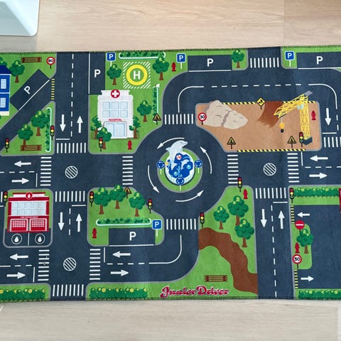 Myydään kuvan LED liikenne leikkimatto autoleikkeihin kokoa 120 x 72 cm. Liikennevaloissa vaihtuu valot.