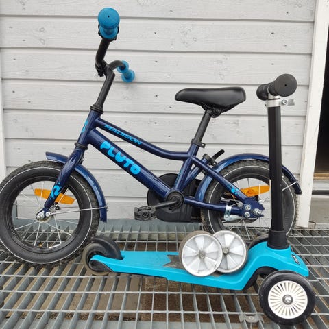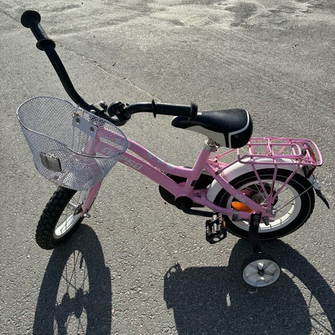 Lasten Crescent merkkinen 12" polkupyörä. Pyörässä on musta runko punaisilla yksityiskohdilla, täyskoteloinen ketjusuoja sekä etulokasuoja. Satula ja vanteet ovat punaiset, ja ohjaustanko on vaalea. Pyörässä on apupyörät, jotka tukevat ajamisen opettelua pienille lapsille. Soveltuu tyypillisesti ensimmäiseksi polkupyöräksi lapselle, jolle 12" koko on sopiva.
