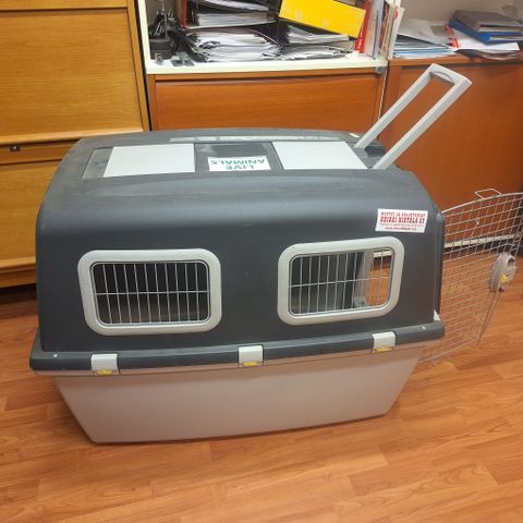 Muovinen kuljetuslaatikko koiralle/ kissalle. Koko 68x48x45. Max paino 20kg.Laatikossa on metallinen ritiläovi edessä ja kantokahva päällä helpottamassa siirtämistä. Tähän löytyy myös renkaat, jolloin helppo vetää perässä vetokahvan avulla. Oviaukon yhdessä kulmassa halkeama, jonka saa korjattua.