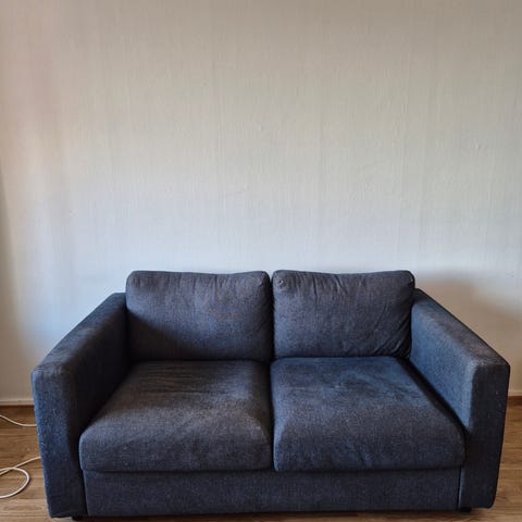 Hyväkuntoinen ja ehjä Ikean Vimle divaanivuodesohva tummanharmaalla vähän likaa hylkivällä päällisellä. Joitakin hyvin haaleita tahroja näkyy, jos oikein syynää, mutta yleisilme on erittäin siisti. Vuodemekanismi ja muut toiminnot kaikki kunnossa. Vuoteen patja on parhaat päivänsä nähnyt ja tahrainen, mutta muuten ihan käyttökelpoinen edelleen.