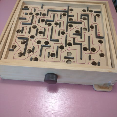 Brio labyrinttipeli. Puinen tasapainopeli, jossa metallikuulaa ohjataan sokkelossa kallistelemalla pelialustaa sivuilla olevilla säätimillä. Peli on valmistettu vaaleasta puusta ja siinä on numeroitu labyrinttirata pudotusreikineen. Soveltuu motoriikan ja keskittymiskyvyn harjoitteluun eri-ikäisille pelaajille. Vain pieni kuula puuttuu.