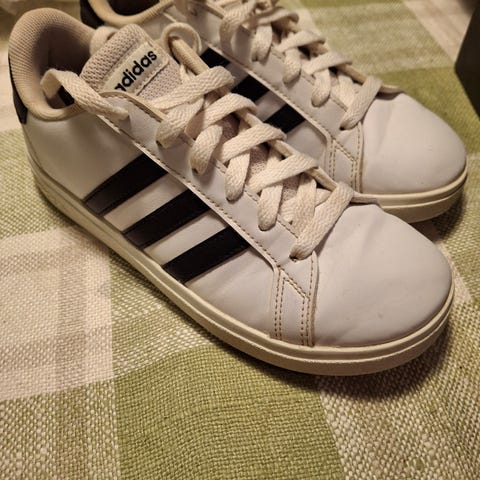 Adidas Refine Adapt tennarit, koko 38. Väri musta valkoisella pohjalla ja jalkapöydän yli kulkevalla joustonauhalla, jossa adidas-logo. Päällinen joustavaa tekstiilimateriaalia, kevyt vaahtopohja. Malli on nauhaton slip-on-tyyppinen, jossa vetolenkit kannassa pukemisen helpottamiseksi.