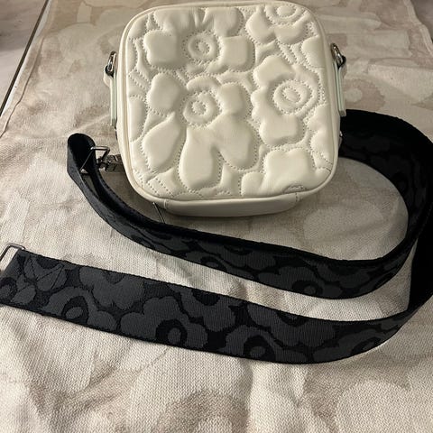 Marimekko Soft Gratha laukku ruskealla unikkohihnalla. Sävy kermanvaalea. Aitoa nahkaa. Erittäin hyvä kunto. Hyvin vähällä käytöllä ollut. Uutena ostaessa paketissa tullessa ollut jo toisella sivulla pieni painaumajälki Marimekon tuotekortista. Dustbag mukaan.
