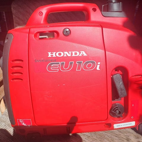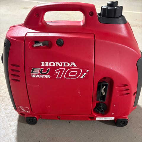 Honda EU20i aggregaatti. Kannettava bensiinkäyttöinen invertteriaggregaatti, jossa on kaksi 230 V pistorasiaa ja ohjauspaneeli laitteen kyljessä. Sopii esimerkiksi sähkötyökalujen ja muiden laitteiden virransyöttöön paikoissa, joissa verkkovirtaa ei ole saatavilla.