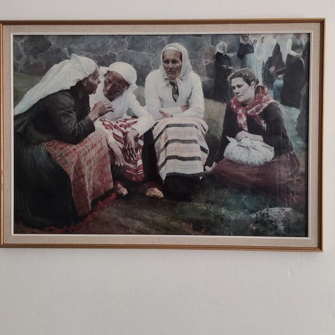 Myydään laadukas puukehys lasilla. Taideteos kuuluu kauppaan, mutta se on hieman elänyt lasin alla, joten itse kehys lienee kiinnostavin. Koko leveys n. 58 cm, korkeus n. 56 cm, paksuus n. 3 cm