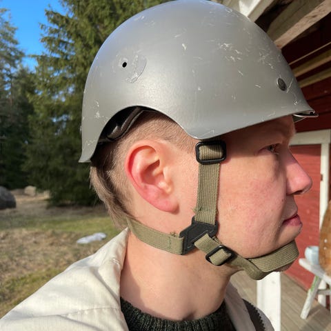 SA M40/55 teräksinen kypärä kokoa 58, jossa sisäpuolella nahkainen sisus ja leukahihna.