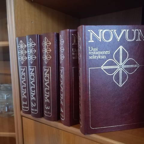 Novum Uusi testamentti selityksin -kirjasarja, osat 1–5. Teokset sisältävät Uuden testamentin tekstin sekä selityksiä ja kommentaareja. Kirjat ovat kovakantisia ja suomenkielisiä. Soveltuvat raamatuntutkimukseen, opiskeluun ja taustamateriaaliksi hengelliseen työhön ja opetukseen. Kulkeutuu Helsinkiin, Turkuun ja Vaasaan.