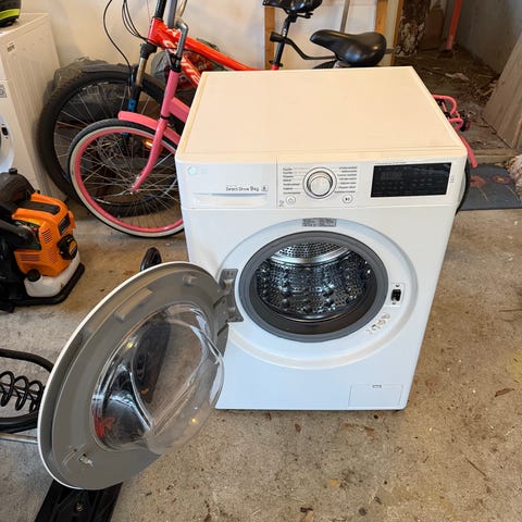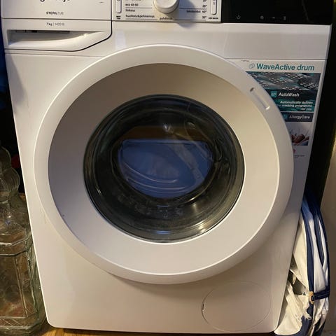 AEG edestä täytettävä pesukone. Ohjelmavalitsimesta löytyy useita pesuohjelmia eri tekstiilityypeille sekä perustoiminnot lämpötilan ja linkouksen säätöön. Kuten kuvista näkyy kahva on rikki, tästä huomimatta kone toimii ja luukun saa kiinni normaalisti.