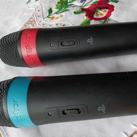 Sony SingStar langattomat mikrofonit USB-vastaanottimella. Pakettiin kuuluu kaksi mustaa mikkiä, sekä USB-liitännällä varustettu vastaanotin.