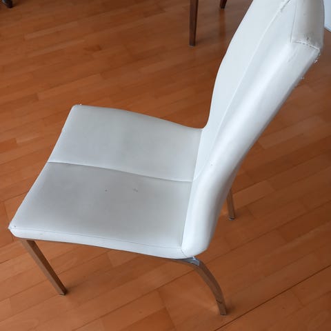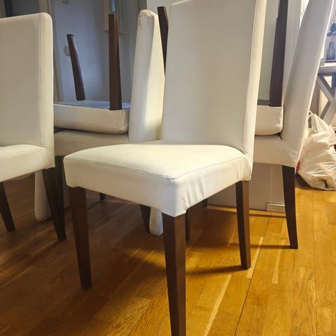 Istuin osassa kangas jo vähän hapertuu pyyhittäessä mutta muuten jykevät ruokapöydäntuolit.