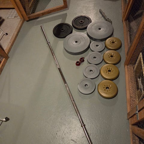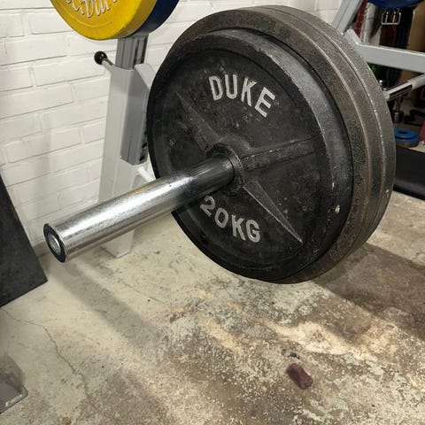 Tarjolla erittäin hyväkuntoinen hybridi levytanko ja 2x20kg Power Linen levypainot,