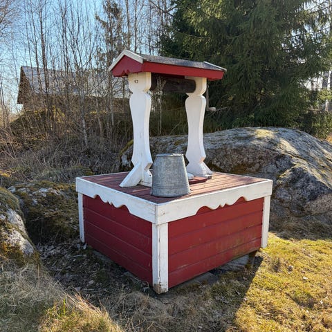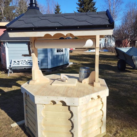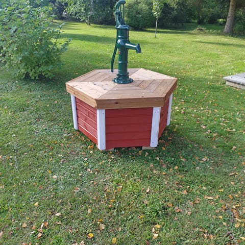 Itse tehty uusi puinen puutarhakaivo / koristekaivo pihalle. Kaivo on kuusikulmainen. Yläosassa on katettu kaivorakenne kahdella valkoisella pystytolpalla ja harjakatolla. Sopii pihan, puutarhan tai pihapolun koristeeksi tai esimerkiksi kukka- ja istutusruukkujen ympärille. Rakennelma on tarkoitettu koristekäyttöön.