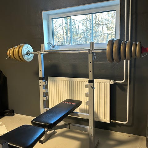 Penkkipunnerrus penkki. Penkin kulma säädettävissä. Levytanko 10kg. Painot 2kpl 20kg, 2kpl 10kg, 2kpl 5kg. Yhteensä 80kg.