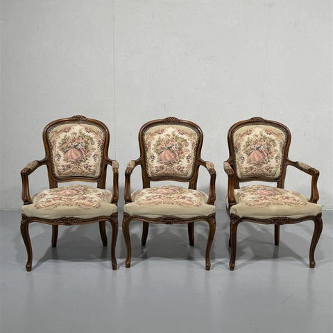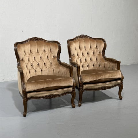 Kaksi rokokoo-tyylistä nojatuolia, joissa on koristeelliset kaiverrukset ja napitettu verhoilu. Tuolit ovat ruskean sävyisiä ja niissä on pehmeät istuintyynyt.