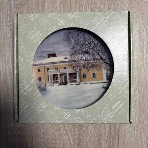 Lautasessa on takana tehdasvalmisteinen ripustuslenkki. Täydellinen keräilykokonaisuus: lautanen on täysin ehjä ja virheetön, ja mukaan tulee alkuperäinen Arabian ikkunallinen säilytyslaatikko sekä tilaajan alkuperäinen saatekirje
