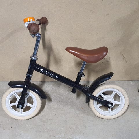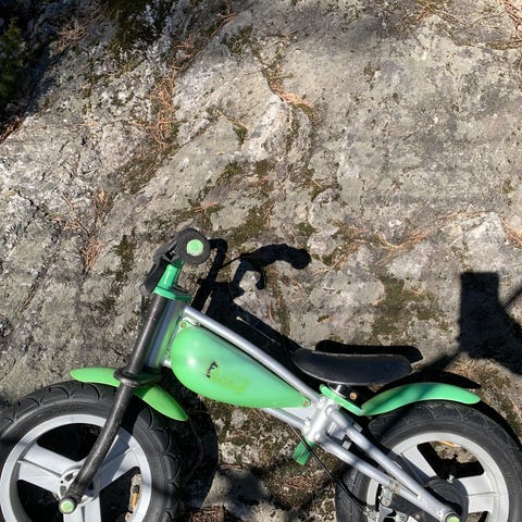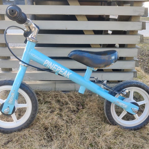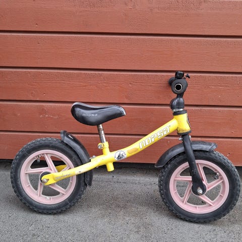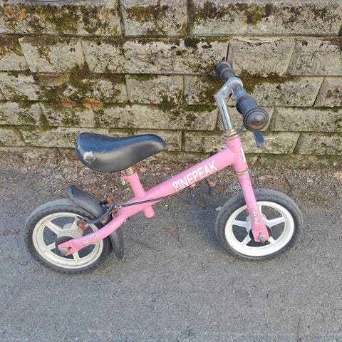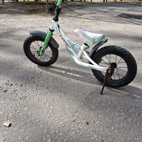Myydään lasten potkupyörä. Siinä on käytön jälkiä (naarmuja), mutta ne eivät vaikuta toimivuuteen. Kaikki toimii hyvin. Kaupan päälle kypärä.