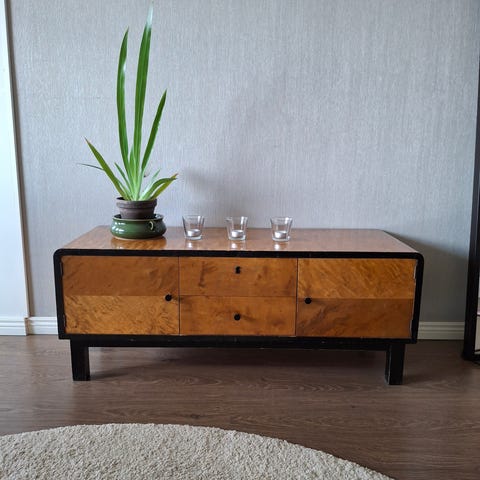 Myynnissä vanha akaasia senkki, lipasto, tv-taso.