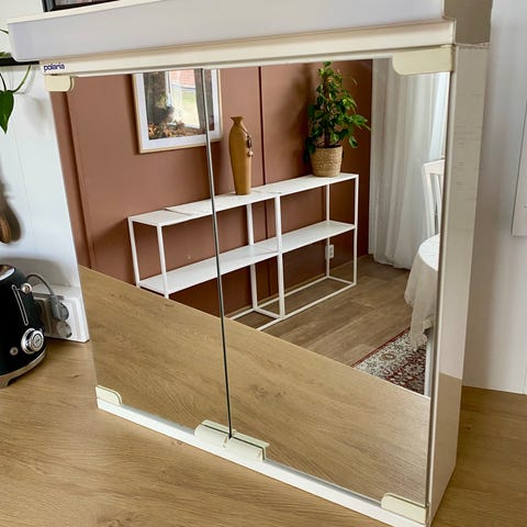 Ostettu n. 2012. Kaksipuolisten peiliovien ja kirkkaan valon ansiosta kätevin mahdollinen ratkaisu, jos itse leikkaa tai muotoilee hiuksia. Lamppu vaihdettu joskus. Pistorasia sisällä. Kuljetus 30 km sisällä mahdollinen.