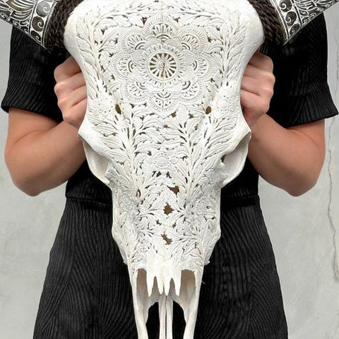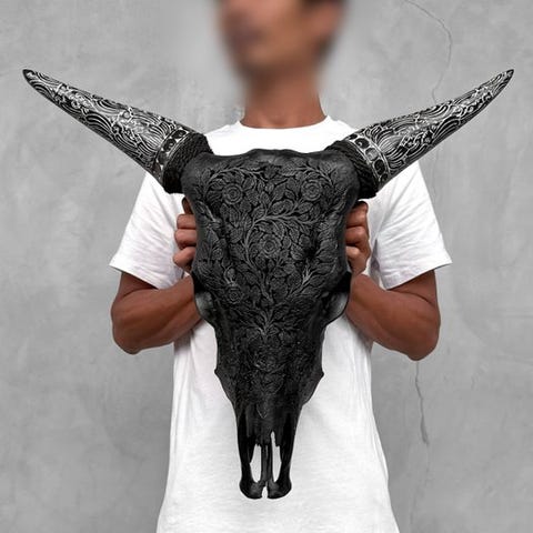 Tämä kaiverrettu naudan pääkallo on upea sisustusesine, joka piristää mitä tahansa kotia tai ravintolaa.Enemmän kuin pelkkä henkinen ja kulttuurinen taideteos; se kertoo myös Indonesian alkuperäiskäsityöläisten tarinan, jotka säilyttävät alkuperäisen tavan käyttää jokainen eläimen osa käsityötaiteen ikuisen työn luomiseen.Tämä kallo on käsin valmistettu Indonesiassa, jossa eläinkalloihin kaiverrettujen kuvioiden taito siirtyy isältä pojalle.He ovat hallinneet tämän ovelan tekniikan ja tarvitsevat noin 5–6 päivää yksityiskohtaisten kaiverrusten tekemiseen, kuten tässä näytteessä.Sarvet on myös kaiverrettu boheemisella tyylillä.Kaiverrettu on kaunis kukka-mandalamotiivi.ARVIOIDUT MITATPituus: 57 cmLeveys: 63 cmHUOM:- Olemme lisänneet muutamia kuvia käsityöläisistämme työn keskellä antamaan käsityksen siitä, miltä kallo on kaiverrettu prosessi näyttää.- MAINITTU PAINO SISÄLTÄÄ PAKKAUSTUOTTEET.ILMOITUSLAUSEKE- Kallon selkäosaan on kiinnitetty nyöri, jotta se voidaan asentaa seinälle.- Sarvet irrotetaan kuljetusta varten ja ne on helppo kiinnittää takaisin. Sarvet ovat aina paketin pohjalla kallon alla. Varmistathan, että poistat sarvet ennen pakkausmateriaalin heteksittämistä pois.- Koska kyseessä on luonnonkallo, siinä voi olla pieniä halkeamia, uurteita tai puuttuvia hampaita. Tämä on normaalia. Katso kuvat.- Kallomme on puhdistettu ammattilaisittain, mutta hampaisiin voi toisinaan ilmestyä pieniä värimuutoksia. Tämä on luonnollista ja normaalia, eikä siihen voi vaikuttaa paljon. Katso kuvat.LÄHETYS- Tuote lähetetään seurantakoodilla DHL Parcelin, DPD:n tai PostNL:n kautta. Seuranta päivittyy Catawiki-luotasi, kun lähetys on jätetty.- Tarkista säännöllisesti ettei lähetys palaudu meille, tässä tapauksessa ostaja vastaa toisen lähetyksen kuljetuskustannuksista.- Espanjaan ja Portugaliin seurannan vuoksi käytä tätä linkkiä ja lisää Catawiki-luotasi seurantanumerohttps://clientesparcel.dhl.es/LiveTracking/HomeYHTEISLÄHETYSTÄ EI TEHDY!!!Jos sinulla on kysyttävää lähetyksestä, ota meihin yhteyttä Catawiki-viestipalvelun kautta. Yritämme vastata kolmen työpäivän kuluessa.
