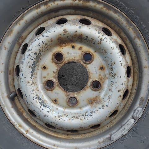Elämää nähnyt Sprinterin rengassarja. Renkaat 225/70R15C ja vanteet 6x15, ET 75, pulttijako 5x130 ja keskireikä 84,1mm. Renkailla ei tee mitään, mutta vanteet voi varmaan johonkin hyödyntää.