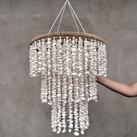 Shell chandelier made from hundreds of tiny white shells hanging from a filigree metal frame. The hanging shell decoration is handmade by artisans in Indonesia and mostly comes with some imperfections such as a partly twisted metal frame or irregularly hanging threads.The chandelier could be used inside with a pendant light to complement any beach, tropical, or bohemian-style interior. Or place it outside on a tree or terrace to catch the breeze and listen to the charming tinkling sound.APPROXIMATE DIMENSIONSWidth: 40 cmHeight: 135 cmDisclaimer > Tämä erä koskee vain simpukkatrihikeä / simpukkatriikin riippuvalaisin.> PAINO MÄÄRITETTY ON SISÄLTÄVÄ KOLLAKKEET SAMMUTETA KORKEUTTA?THE SHIPPING-The item will be sent with a Track & Trace code via DHL Parcel, DPD or postNl. The tracking information for your Catawiki lot will be updated once your parcel has been dropped off. -Please check regularly to avoid your parcel being returned to us, in which case the buyer will be responsible for the shipping costs of the 2nd shipment.-For tracking to Spain and Portugal please use this link and add the tracking number from your Catawiki lot https://clientesparcel.dhl.es/LiveTracking/Home-WE DO NOT COMBINE SHIPPING!!!-If you have any questions about your parcel please contact us using the Catawiki message service. We will try to reply within 3 working days.
