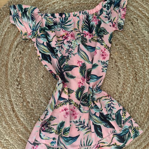 Selling this beautiful and breezy summer romper from H&M. It features a lovely white floral print on a red background. Made of 100% viscose, the fabric is soft, lightweight, and perfect for hot weather.