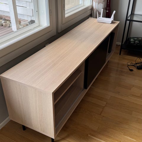Kulmamallinen tv-taso harmaalla pinnalla ja kahdella lasiovella. Tasossa on sisähyllyt säilytystä varten. Mitat näkyvät kuvissa mittanauhan kanssa. Sopii televisiolle ja mediavälineiden säilytykseen olohuoneessa tai muussa oleskelutilassa.