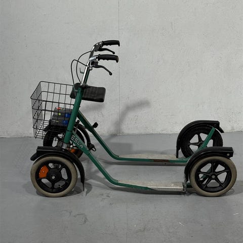 Esla potkulauta tai potkupyörä, jossa on neljä pyörää, käsijarrut ja etukori. Vihreä runko ja mustat kahvat. Mukana korissa lisäksi kaksi 12 tuuman sisärengasta.Potkulaudassa on havaittavissa käytön jälkiä, mutta se on muuten hyvässä kunnossa.