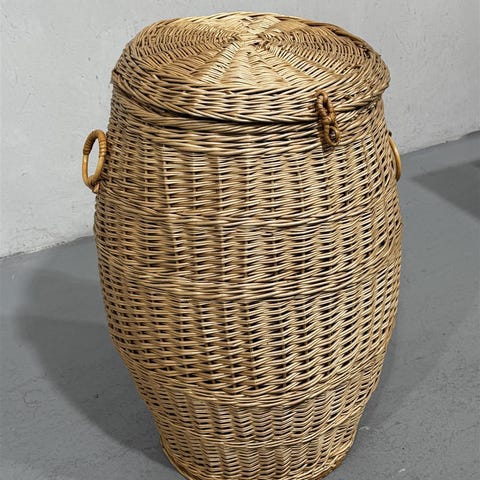 Korkea punottu rottinkikori, jossa on kaksi kahvaa ja aukeava, pyöreä kansi jossa myös kiinnikepaikka. Kori on tilava ja sopii monenlaiseen säilytykseen. Kannen kiinnitys on yksinkertainen ja käytännöllinen.