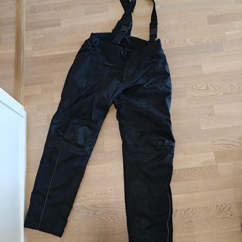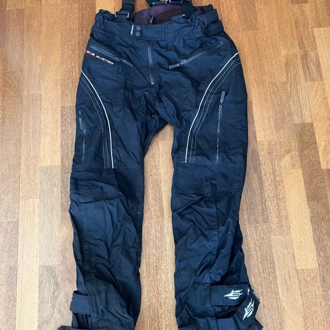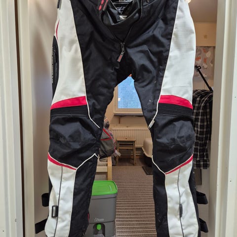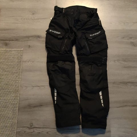 Sweep Fashion D-Fit housut, koko 42. Väri musta. Housuissa vetoketjutasku edessä ja vyötäröllä säätömahdollisuus. Lonkkapehmusteet, polvisuojat ja tikkaus joustoa varten. Irrotettavat vesitiivis vuori sekä toppavuori. Hyväkuntoiset. Mitat näkyy kuvissa