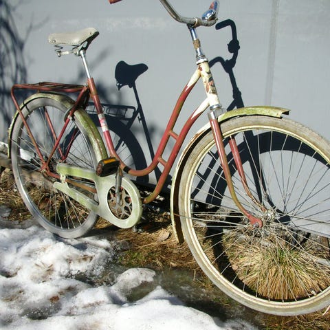 50-60-luvun Monark, ajokuntoinen muuten, mutta polkimet pyörii eteenpäin pyrkiessä enimmäkseen tyhjää.