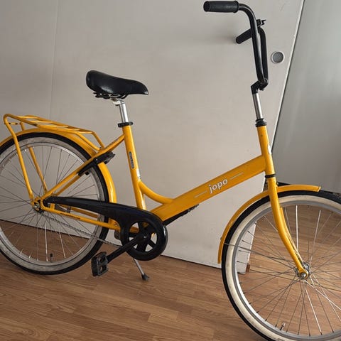 Harmaa jopo polkupyörä, mukaan saa korin, talvi-/nastarenkaan omalla vanteellaan, takavalon sekä yhden avaimen lukkoon.