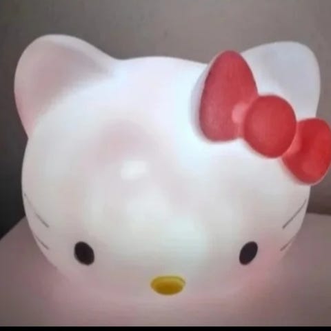 Tästä söpö valaisin vaikka lastenhuoneeseen tai Hello Kitty -fanille! Antaa pehmeän valon ja näyttää samalla tosi kivalta sisustuksessa. Kunto hyvä ja toimii niin kuin pitää.