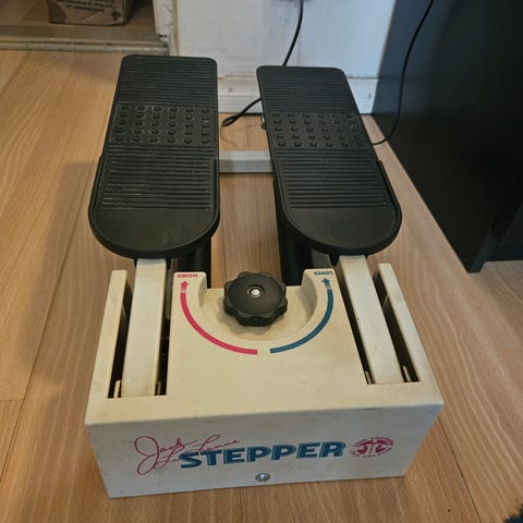 Twist & Shape kuntolaite, kääntyvä stepperi-tyyppinen harjoituslaite kotiin. Laitteessa on tukikaari käsille, jalkatasot kahdelle jalalle sekä digitaalinen näyttö, josta voi seurata harjoituksen tietoja (esim. aikaa). nouto Roihuvuori. 5€