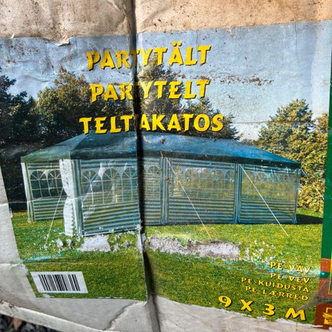 Juhlateltta ulkokäyttöön. Koko 5 x 8 m, korkeus noin 2,78 m. Väri valkoinen ja vaaleanharmaa. Tukeva ja jämäkkä, ei mikään rimpula halpisteltta. Käytössä olleet seinät pakattu kuivana ja puhtaana.